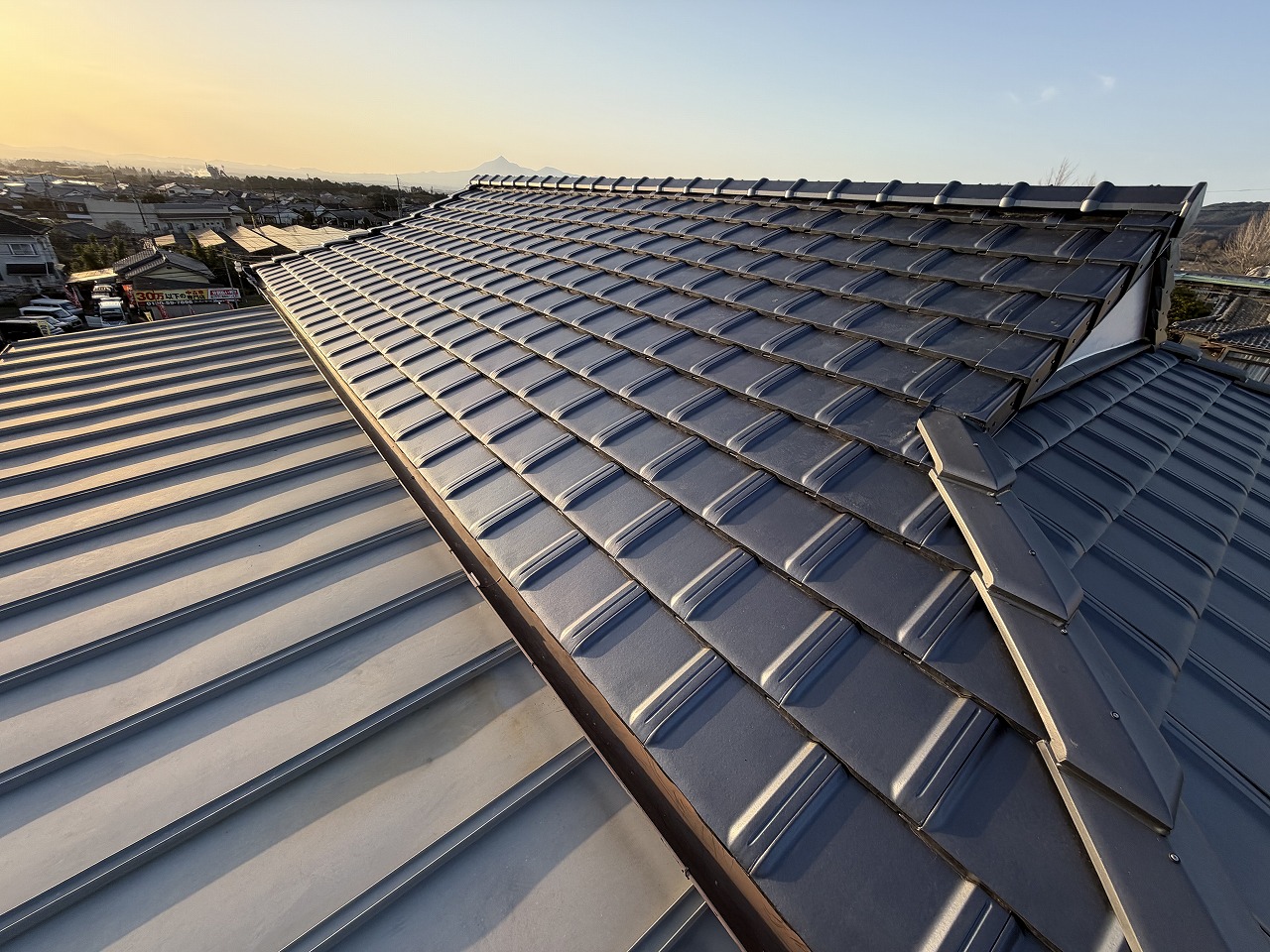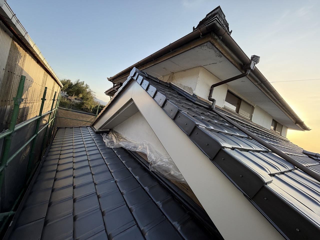 目指して屋根形状を改修の上、陶器瓦の平板瓦を施工させて頂きました。住宅の雰囲気がガラリと変わり